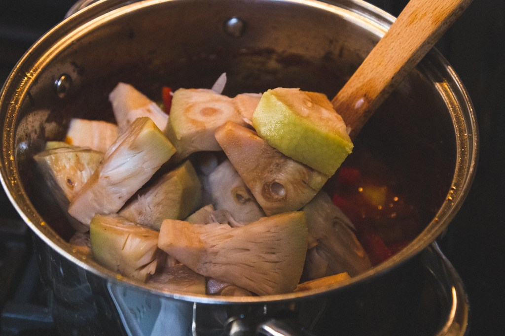 - Mash jackfruit piece with backside of wooden spoon. This helps break up the fiber and get the shredded texture we’re looking for.