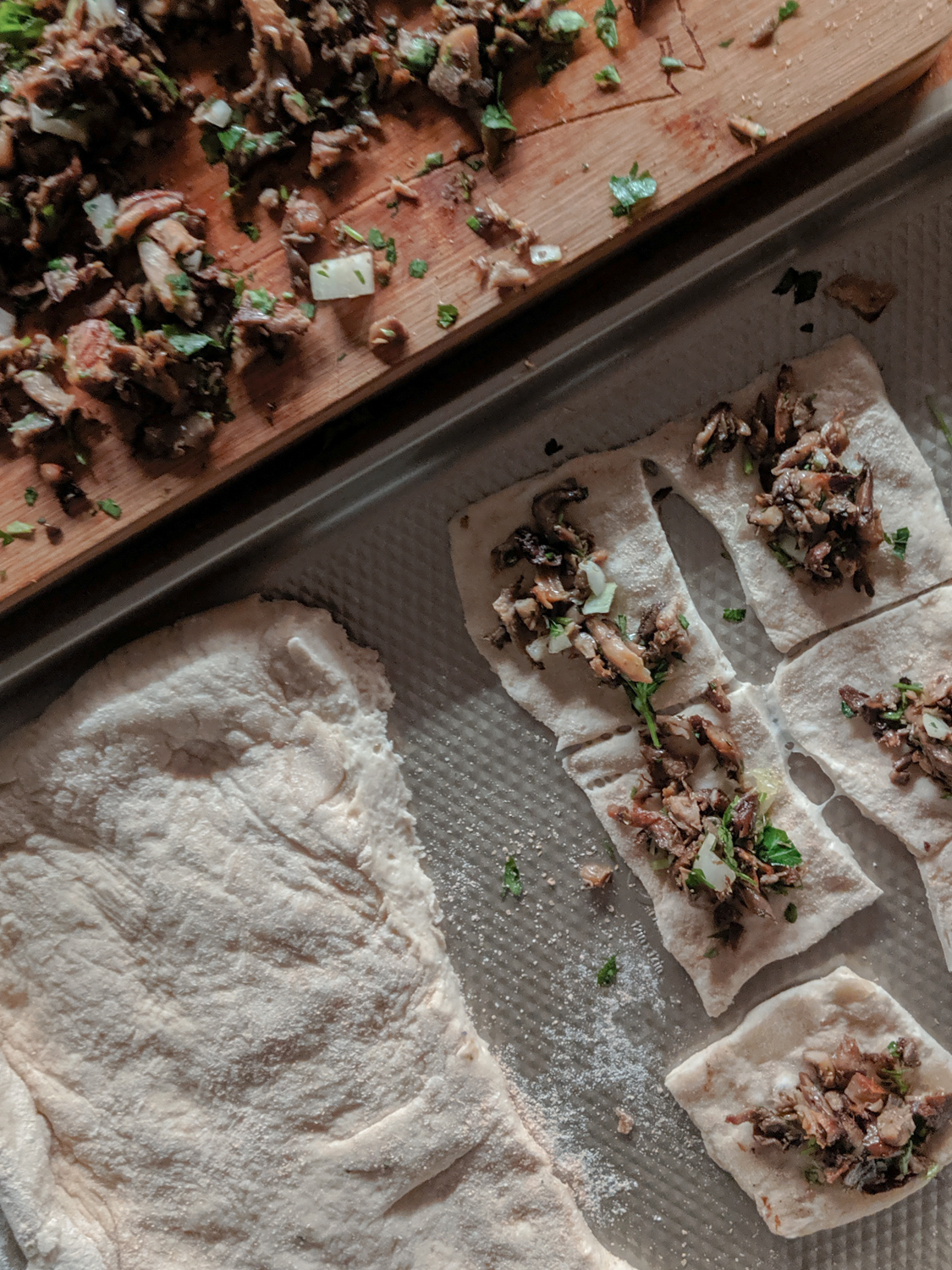 - Stretch each square with your fingers and fill with a tsp. of the mushroom mixture.