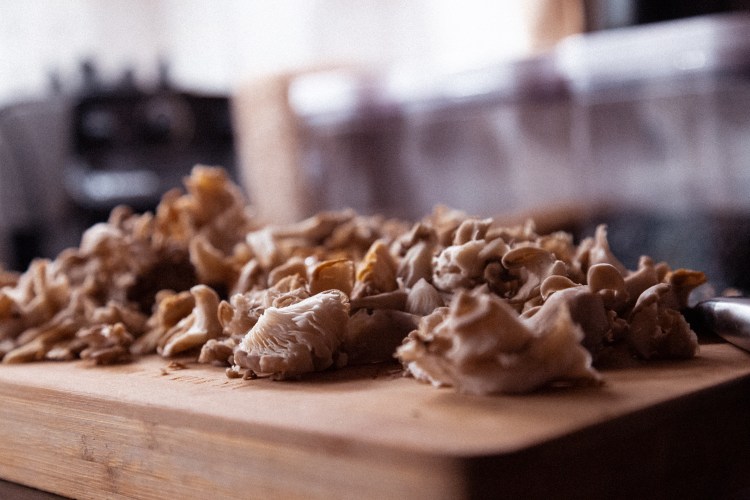 - Place mushrooms on a cutting board and use a knife to chop into smaller pieces.
