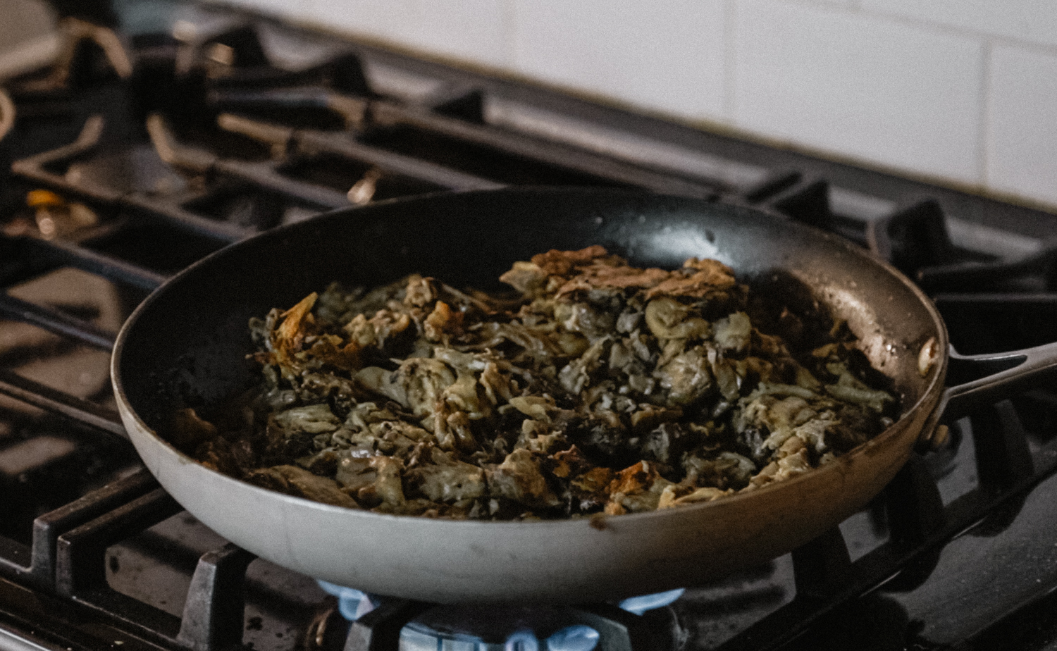 - Gather the mushrooms into the center of the pan, cover with aluminum and place some weight on them. I used a cast iron skillet and a full tea pot. Cook on medium-high heat for 5 minutes.
